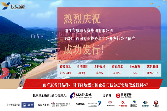 2024年1月19日,市城投集團在深圳證券交易所成功發(fā)行“陽江市城市投資集團有限公司2024年面向專業投資者非公開發(fā)行公司債券”。本期債券發(fā)行規(guī)模為5.5億元,期限為5(3+2)年,票面利率3.10%,全場認購倍數超過4.8倍,是...